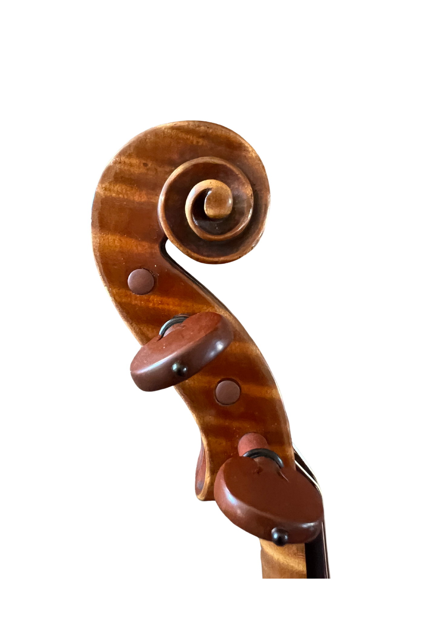 This violin is made from a personal Guarneri ‘del Gesù’ Lord Wilton model using a one-piece back cut on the quarter from Bosnian maple. The curl is of broad width and ascends to the bass side. The scroll and ribs are of similar wood. The two-piece top is of European spruce and broadens toward the flanks. The violin is finished with a red-orange varnish on a golden ground and is antiqued.
